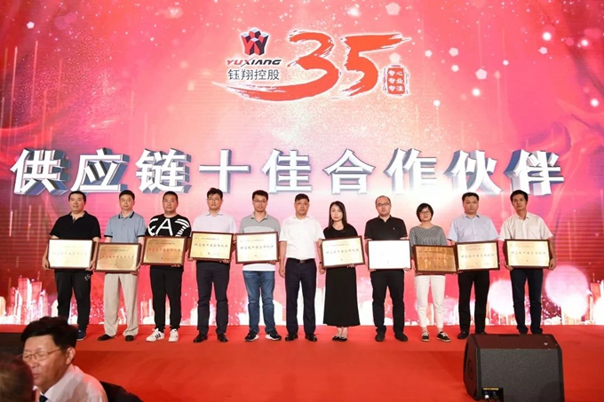 論壇現場還對大漢供應鏈有限公司、東嶺集團股份有限公司、浙商中拓集團股份有限公司 、浙江物產金屬集團有限公司、華南物資集團有限公司、上海寶合實業股份公司、重慶晉邦鋼鐵有限公司、合肥前樓物資有限公司、上海華磊企業發展有限公司、江陰運昌鋼鐵貿易有限公司等十家鈺翔控股集團“供應鏈十佳合作伙伴”進行了現場授牌。