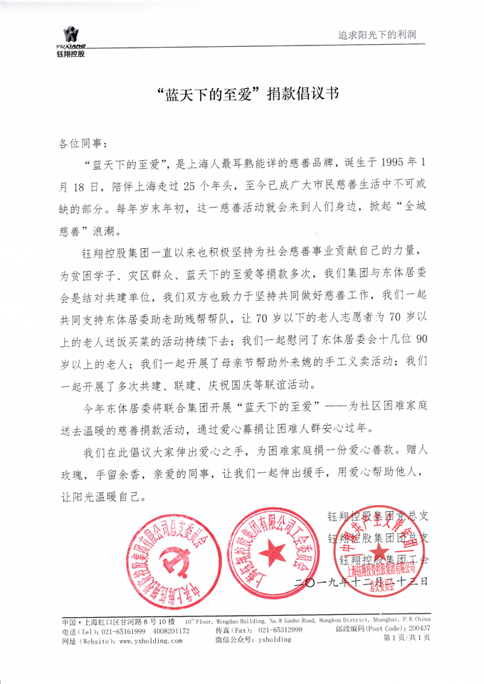 鈺翔控股集團(tuán)創(chuàng)立35年來,一直積極堅(jiān)持為社會慈善事業(yè)貢獻(xiàn)自己的力量,為貧困學(xué)子、災(zāi)區(qū)群眾、藍(lán)天下的至愛、社區(qū)建設(shè)等捐款、捐物多次,累計(jì)捐款已超500萬元,為社會慈善貢獻(xiàn)了自己的力量。集團(tuán)與東體居委會是結(jié)對共建單位,雙方也致力于堅(jiān)持共同做好慈善工作,一起共同支持東體居委助老助殘幫幫隊(duì),讓70歲以下的老年志愿者為70歲以上的老人送飯買菜的公益志愿活動持續(xù)下去。此外,我們還不定期慰問東體居委會十幾位90歲以上的老人;一起開展母親節(jié)幫助外來媳的手工義賣活動;一起開展多次共建、聯(lián)建、慶祝國慶等聯(lián)誼活動。集團(tuán)黨總支還與崇明區(qū)城西小區(qū)、元六村等共建單位開展了豐富多彩的結(jié)對共建活動。