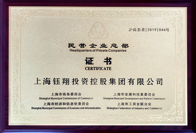 上海市商務(wù)委員會、上海市發(fā)展和改革委員會、上海市經(jīng)濟和信息化委員會、上海市工商業(yè)聯(lián)合會等部門聯(lián)合認定集團為上海市民營企業(yè)總部,并已在近期向我集團頒發(fā)證書。