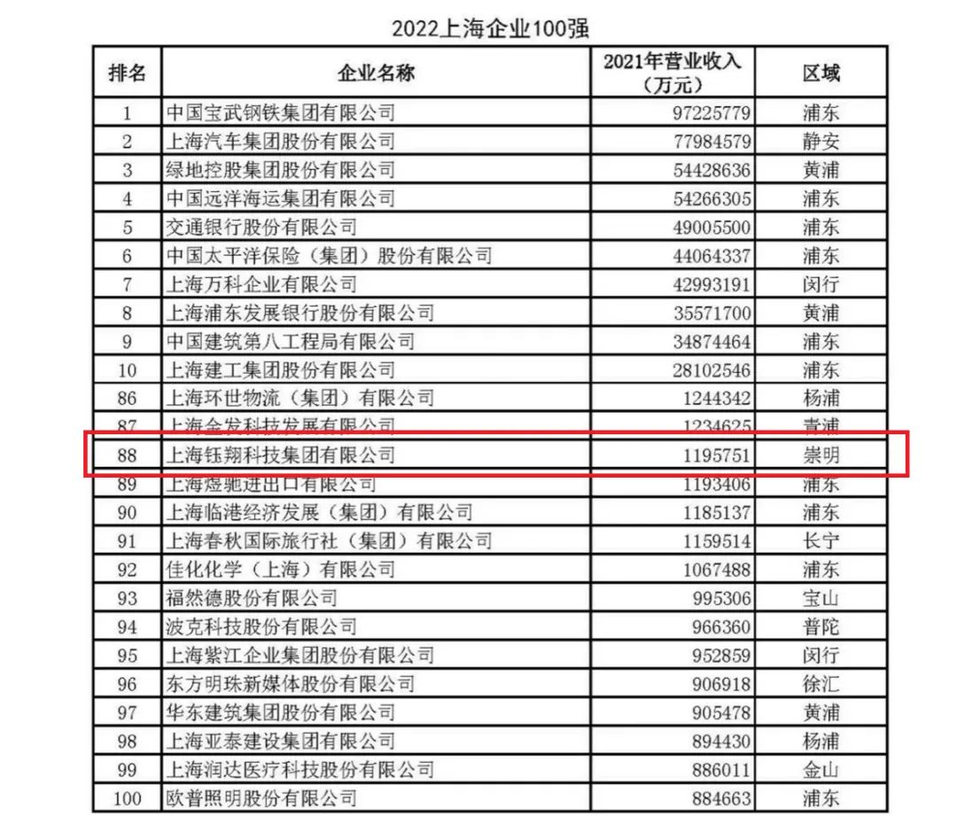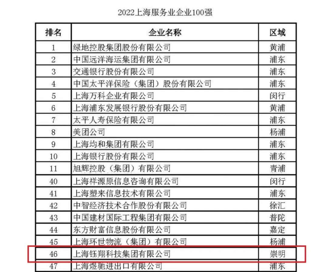 上海鈺翔科技集團有限公司憑借卓越的綜合實力、持續提升的科技創新能力,2021年實現營業收入119.5億元,榮獲“2022上海企業100強第88名”、“2022上海民營企業100強第40名”、“2022上海服務業企業100強第46名”、“2022上海民營服務業企業100強第24名”四項榮譽。