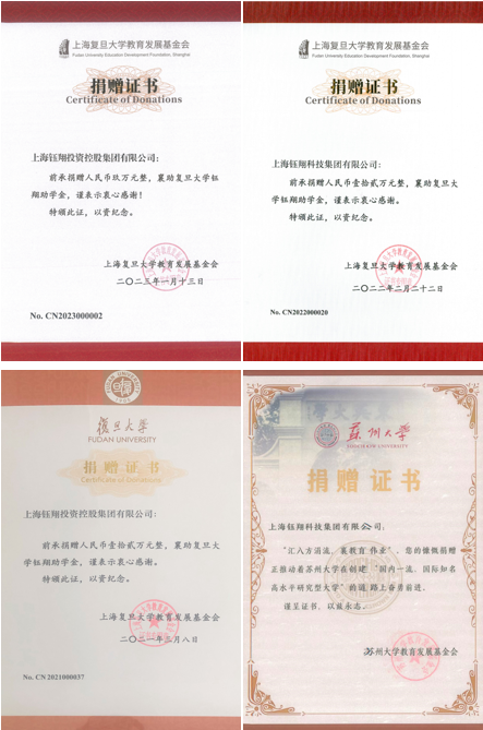 為支持教育事業發展,勉勵家庭經濟困難新生刻苦鉆研、勤奮學習,幫助其完成大學學業。鈺翔科技集團于2014年分別與復旦大學和蘇州大學簽訂了助學金捐贈協議,約定自2014年至2024年,針對復旦大學和蘇州大學家庭經濟困難生進行資助,每年資助10名學生。