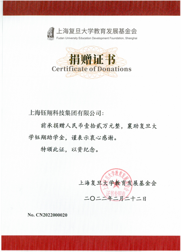 上海復(fù)旦大學(xué)教育發(fā)展基金會12萬元捐贈證書