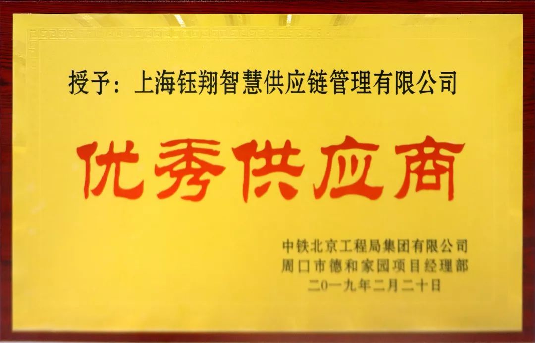近日,上海鈺翔智慧供應鏈管理有限公司被中鐵北京局周口市德和家園項目評為優秀供應商。鈺翔智慧前期對客戶按照集團“三大四看”進行詳細調研,同時根據客戶的實際需求,為客戶量身定制了建材供應鏈管理方案,協調集團采購和物流配送中心,按時按需準確配送,為客戶順利施工提供了保障。
